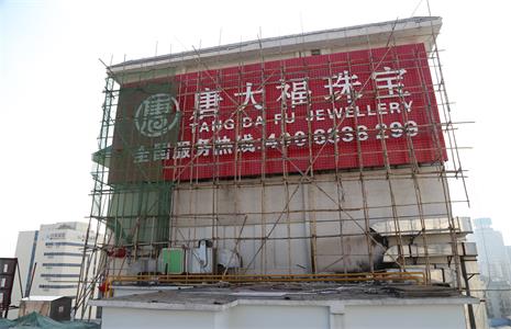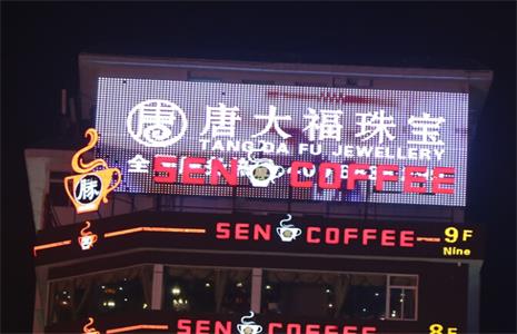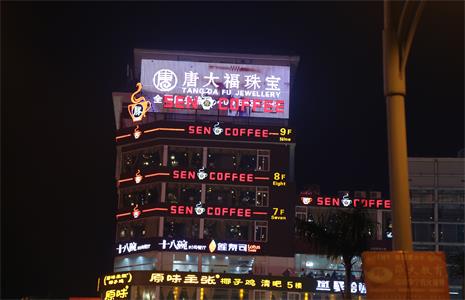 海口唐大福珠宝外墙灯光LED灯具由鑫四禾提供,底板像素屏采用3公分全彩LED点光源,配铝材轨道安装,铝材氧化成红光的,上面放12MM单色外露冲孔字。