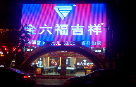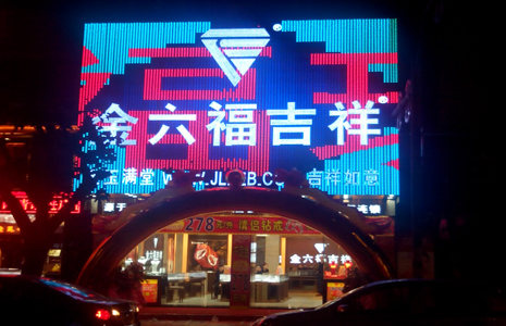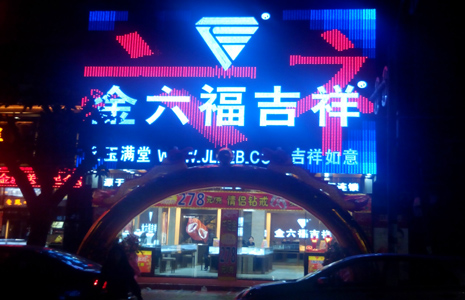 此为金六福吉祥东莞新店LED招牌像素屏工程,采用白色LED发光字+全彩像素屏背景的方式,形成光彩夺目的店铺品牌与形象展示工具,效果非常出色。