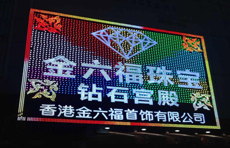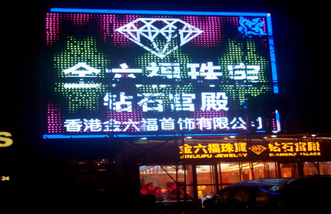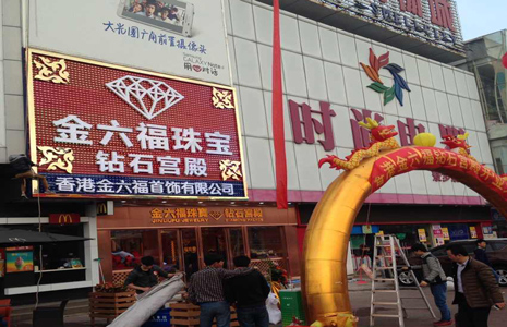 此为金六福钻石宫殿东莞新开业店铺的亮化装饰工程,采用LED招牌像素屏搭配白色LED发光字的方案,四角有金色图案,四周用金色边框包围,白天和夜间都有非常良好的视觉效果,是店铺展示品牌形象的良好阵地,效果非常优秀。