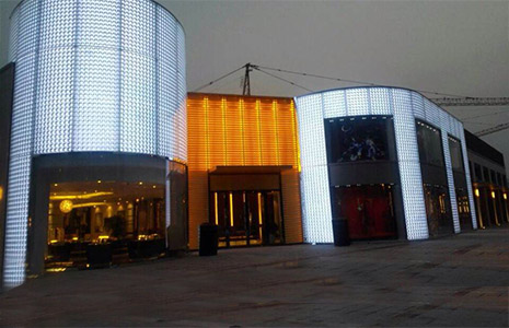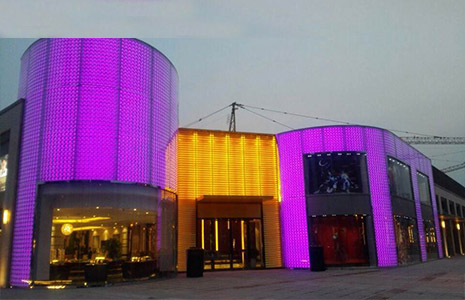 此次项目主要采用40MM六灯二次封装LED点光源,该项目一期主要针对裙楼外墙装饰LED灯光亮化,灯光显示面积达到600多个平方,间距18公分,总计40全彩LED点光源数量18300个,单色黄光40LED点光源1200个。