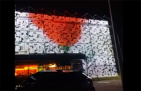 外墙显示面积224个平方,由不同花纹板块组合而成,点间距10CM,采用3CM全彩LED像素灯,总计10600PCS像素灯,技术人员在现场指导安装调试,客户对亮灯之后的实际效果十分满意,对我们的服务也是给予很高的评价。