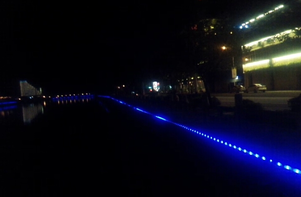 此项目总计3400米,河道两边都装,一米装2个点光源,采用50MM全彩点光源,交流同步控制系统,配铝材安装,整体效果简单大气,速度缓慢,晚上亮灯之后给这座城市增添了一道亮丽的风景线。