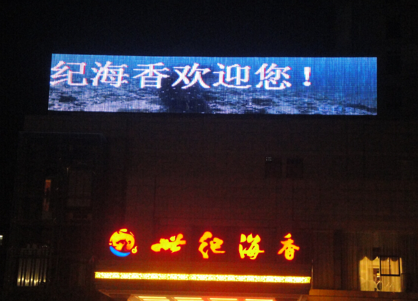 江苏靖江世纪海香酒店采用灯具:SMD16像素灯条,显示面积:112平方,安装间距:8CM。灯具数量:1400米。采用扣板贴画,LED像素灯条安装在扣板之间,白天是一块喷绘写真,晚上就是一块显示屏的效果。