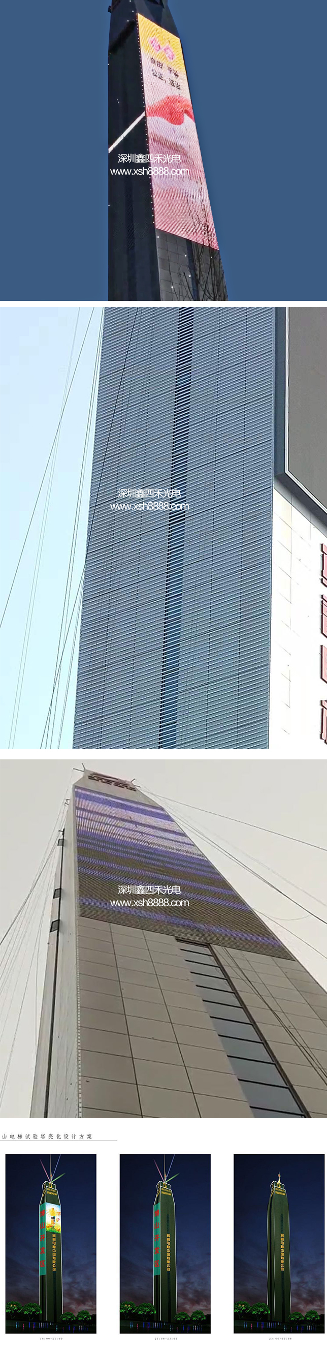 淄博博山开区宾爵电梯 宾爵电梯(中国)有限公司办公室地址位于山东重要的石油化工基地淄博,山东省淄博市博山区九州路36号,采用SH-30S3RGBF-512LED点光源,带铝材横向安装,安装间距12.5CM(一米8颗)。三个面各一块LED像素屏,总共60000余颗点光源,联机控制。达到一个很好的视频宣传效果。
