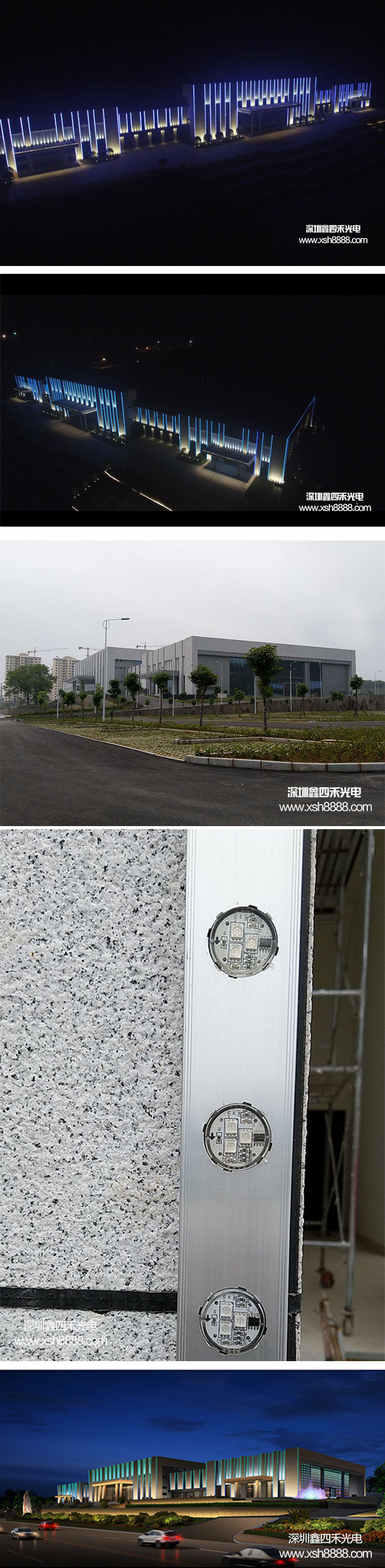 贺州国际石材展示中心 贺州市,广西壮族自治区下辖市,位于广西东北部,地处湘粤桂三省交界地,贺州国际石材展示中心外墙采用SH-30S3RGBF-512的点光源带铝形安装。两侧采用SH-90S18RGBF-512的点光源点缀效果,和LED投光灯完美结合。