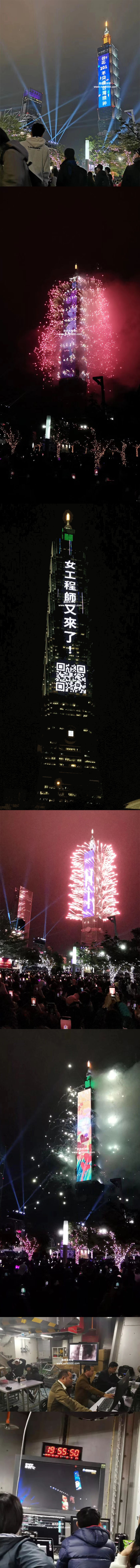 台北101大厦烟火共16000发,时长300秒,配合动画和音乐等元素惟妙惟肖的展现出台湾自然之美;搭配鑫四禾LED网格屏,全覆盖式透明悬挂于大楼,呈现了井井有序的视觉效果;彰显台北101不只是台湾精神。