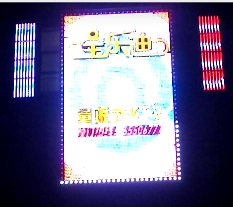 此工程背景采用12MM全彩外露灯制作而成,白天显示喷绘图效果,晚上亮灯是一块全彩显示屏,一个平方169个点,70来个平方,总计用点11800多个,四周安装LED点光源跑边框,