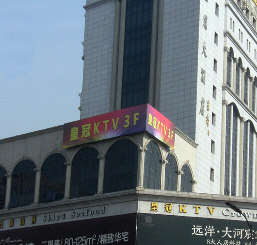 此工程采用3公分三灯二次封装点光源,一个平方100个点,总计4300个点,采用铁板冲孔安装,晚上亮灯效果类似于显示屏,既能出字,又能出图案。起了一个很好的广告效益。