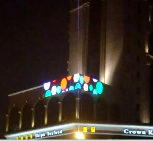 产品名称:30MM全彩二次封装LED点光源。 LED数量:4300PCS。 显示面积:43个平方。 安装时间:2012.8.