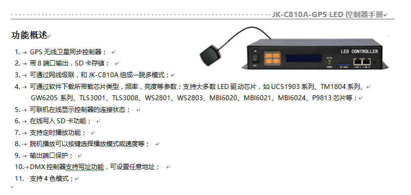 GPS无线卫星同步控制器; 带8端口输出,SD卡存储; 可通过网线级联,和JK-C810A组成一脱多模式